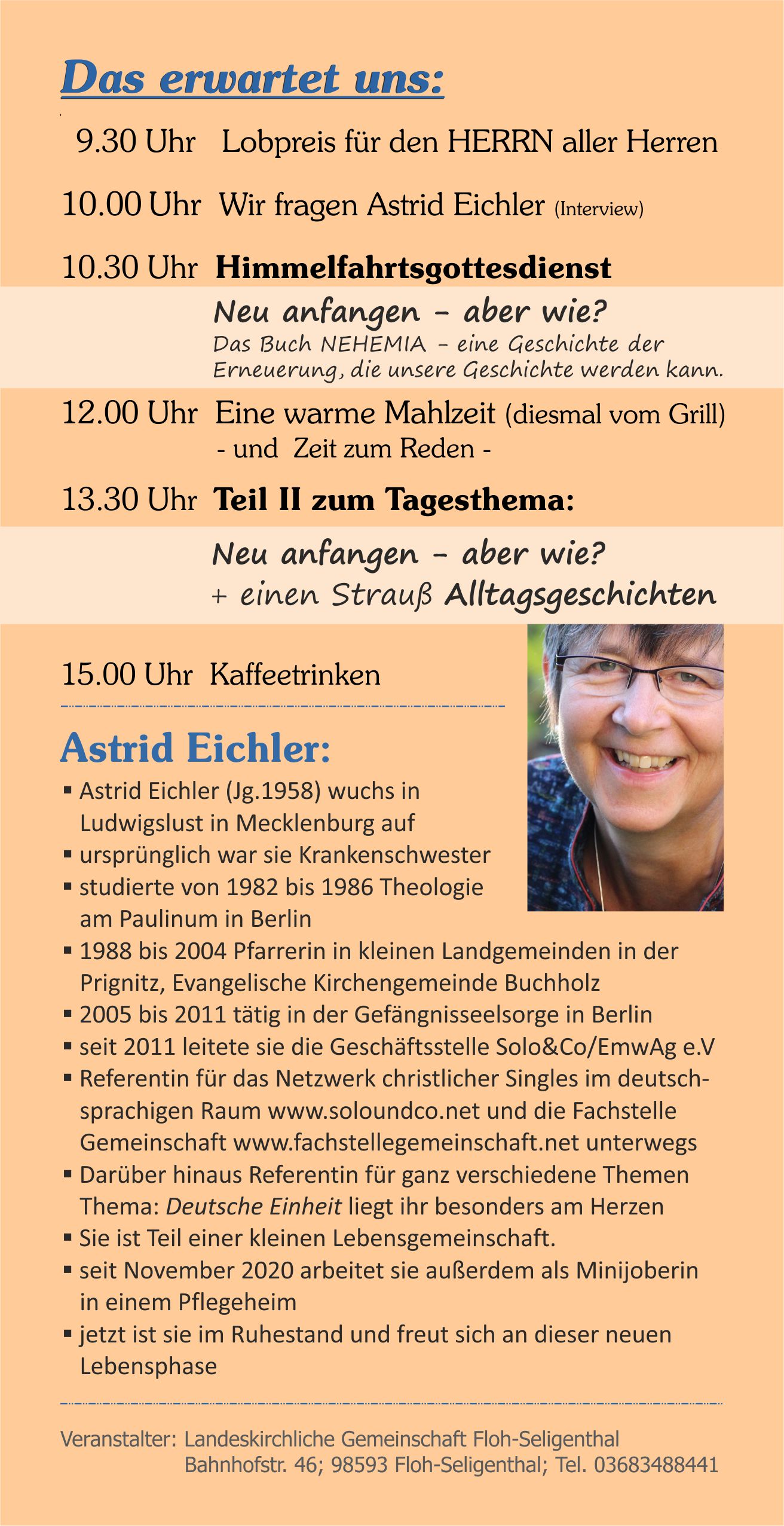 Jedes Jahr an Himmelfahrt gibt es in der LKG einen besonderen Bibeltag. In diesem Jahr haben wir Astrid Eichler eingeladen, den Himmelfahrtsgottesdienst und den zweiten Teil des Tagesthemas nach dem Mittag zu gestalten. Das Tagesthema lautet dieses Mal: „Neu anfangen – aber wie?“. Dabei wird Astrid Eichler das Buch Nehemia als Inspiration einer Geschichte von Erneuerung unter die Lupe nehmen, die auch zu unserer Geschichte werden kann.